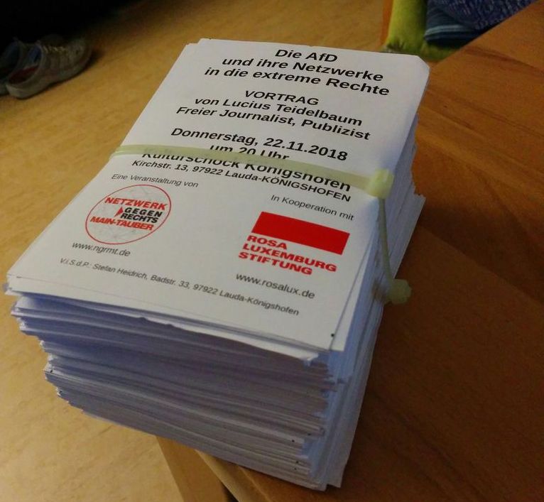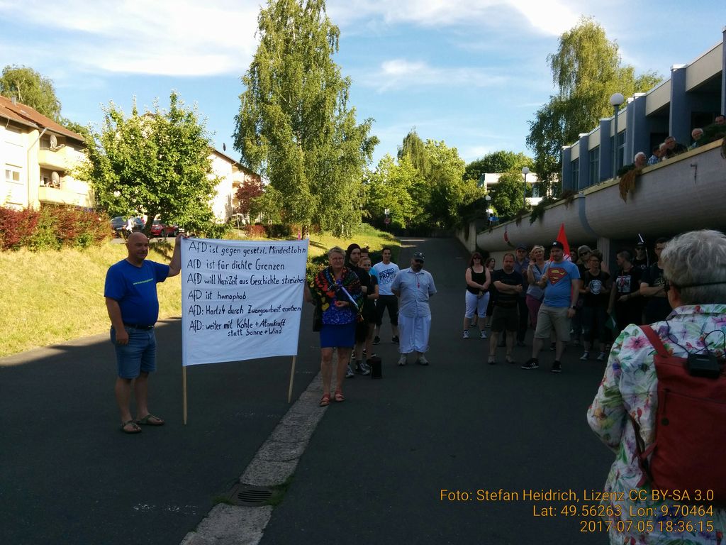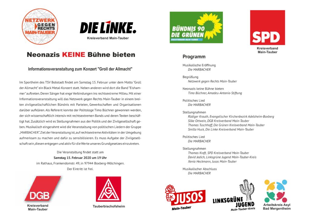 durch Initiative Lebendige Demokratie Eberbach, Herz statt Hetze Neckar-Odenwald, Netzwerk gegen Rechts Main-Tauber, Aktionsbündnis für Demokratie und Menschenrechte Neckar-Odenwald, Initiative Mosbach gegen Rechts und der Arbeitskreis Toleranz und Vielfalt Osterburken